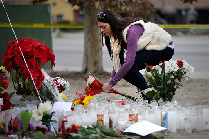 Jennifer Caballero places flowers at a makeshift memorial honouring the victims of the San Bernardino shooting rampage, Friday, Dec. 4, 2015, in California. AP Photo/Jae C. Hong