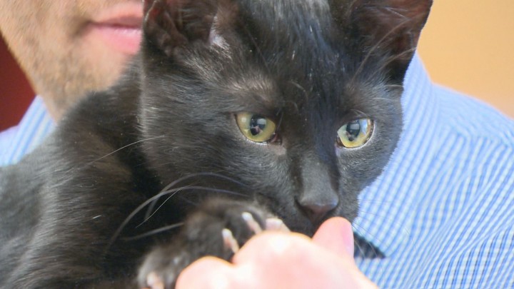 Officials with the company say they don’t know how this little black kitty they’ve named “Spooky” got into a blue recycling bin but it’s from Saskatoon and ended up in their care around 10 o’clock Thursday morning after curiosity literally almost killed the cat.