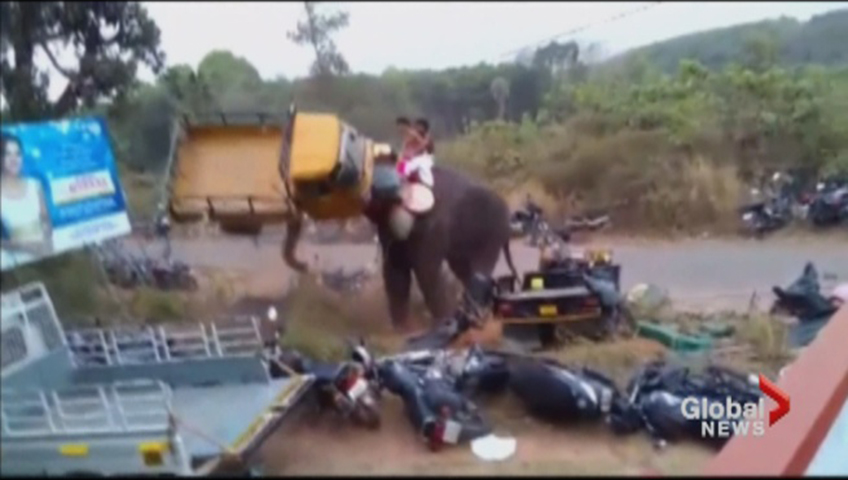 A religious festival in Palakkad, India turned into a chaotic scene last Thursday when an elephant broke loose and went on a rampage tossing a vehicle about like a child’s toy.
