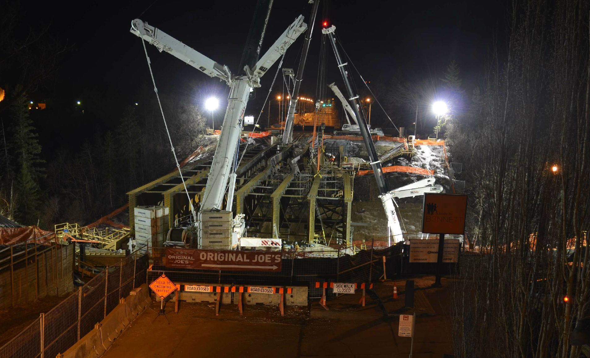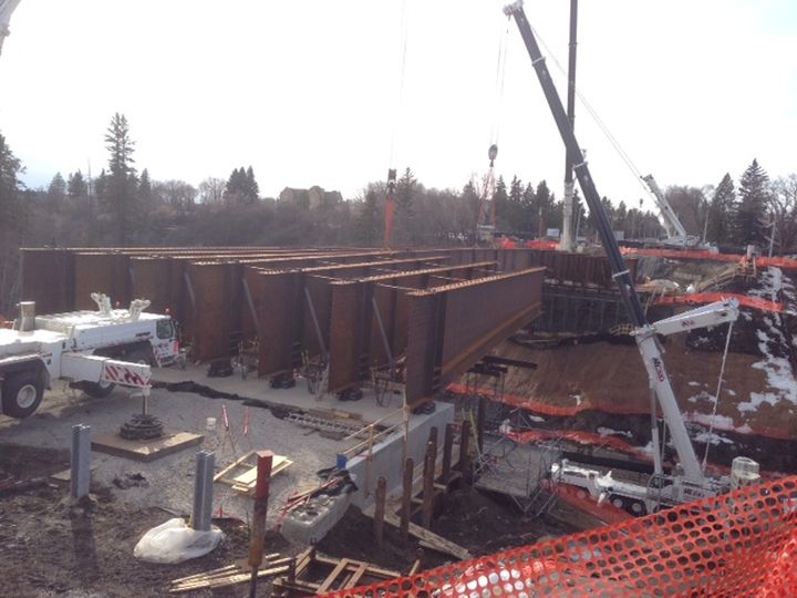 Three of the girders mysteriously buckled on March 16, which forced the closure of a portion of Groat Road for several weeks as crews worked to stabilize the structure.