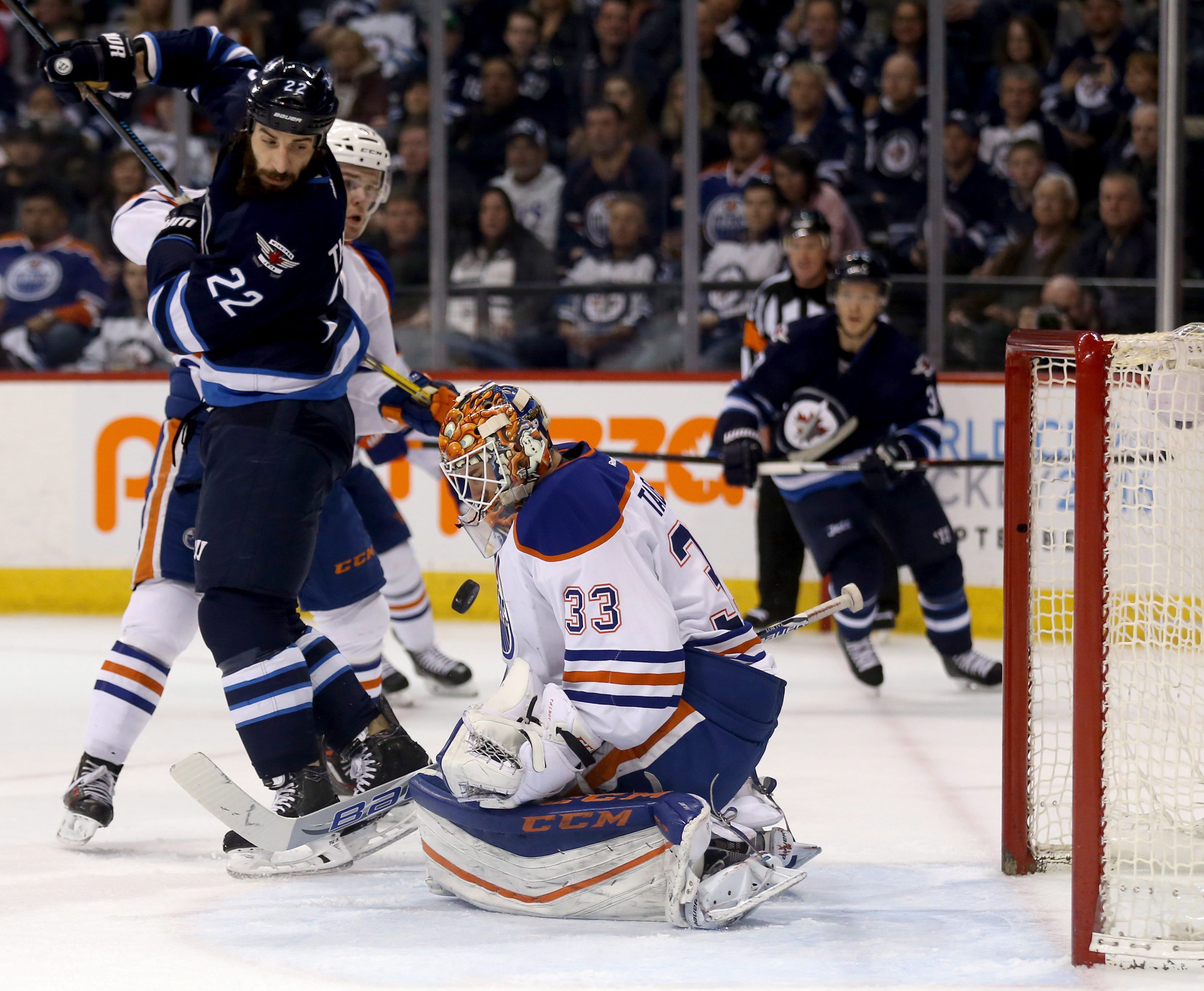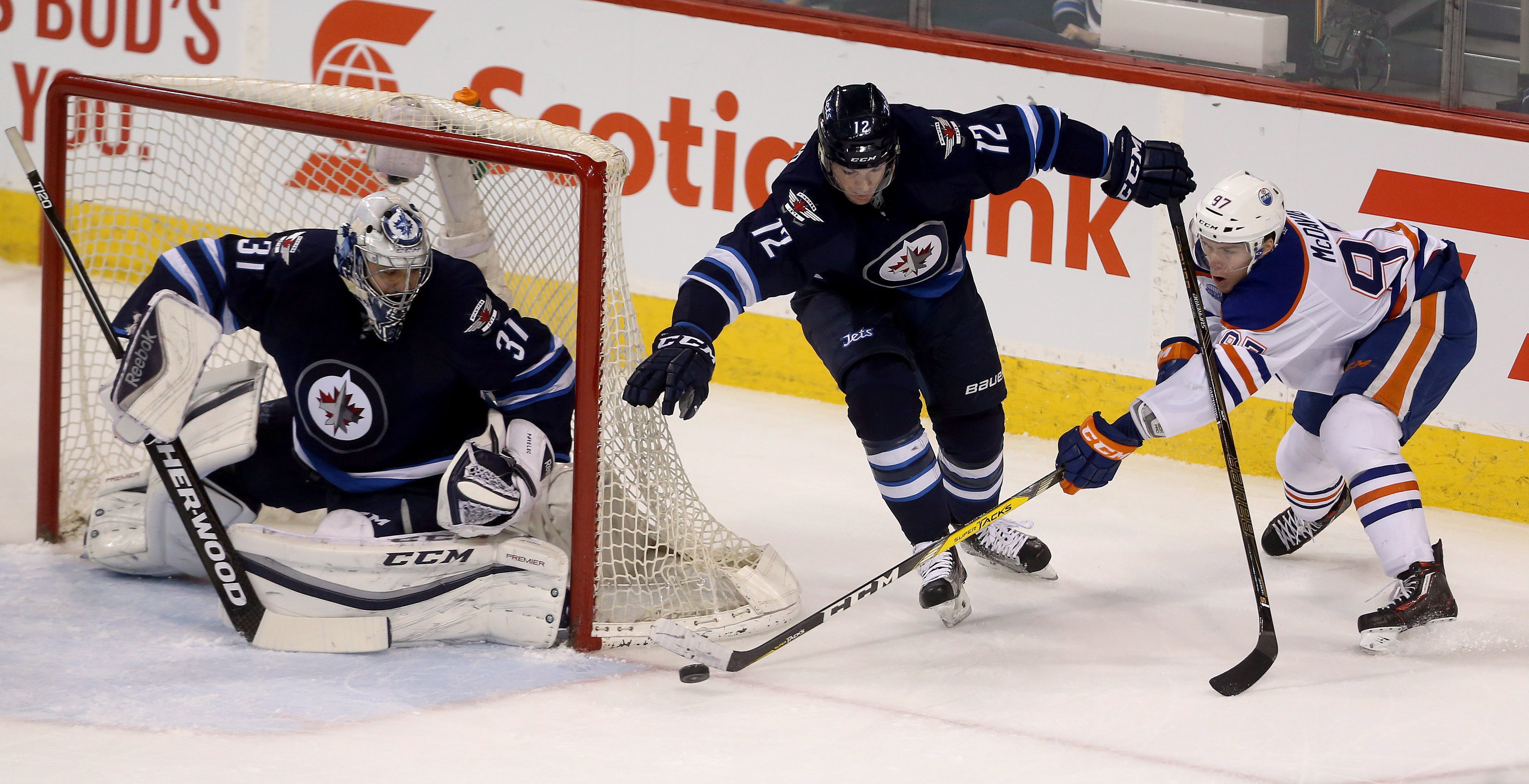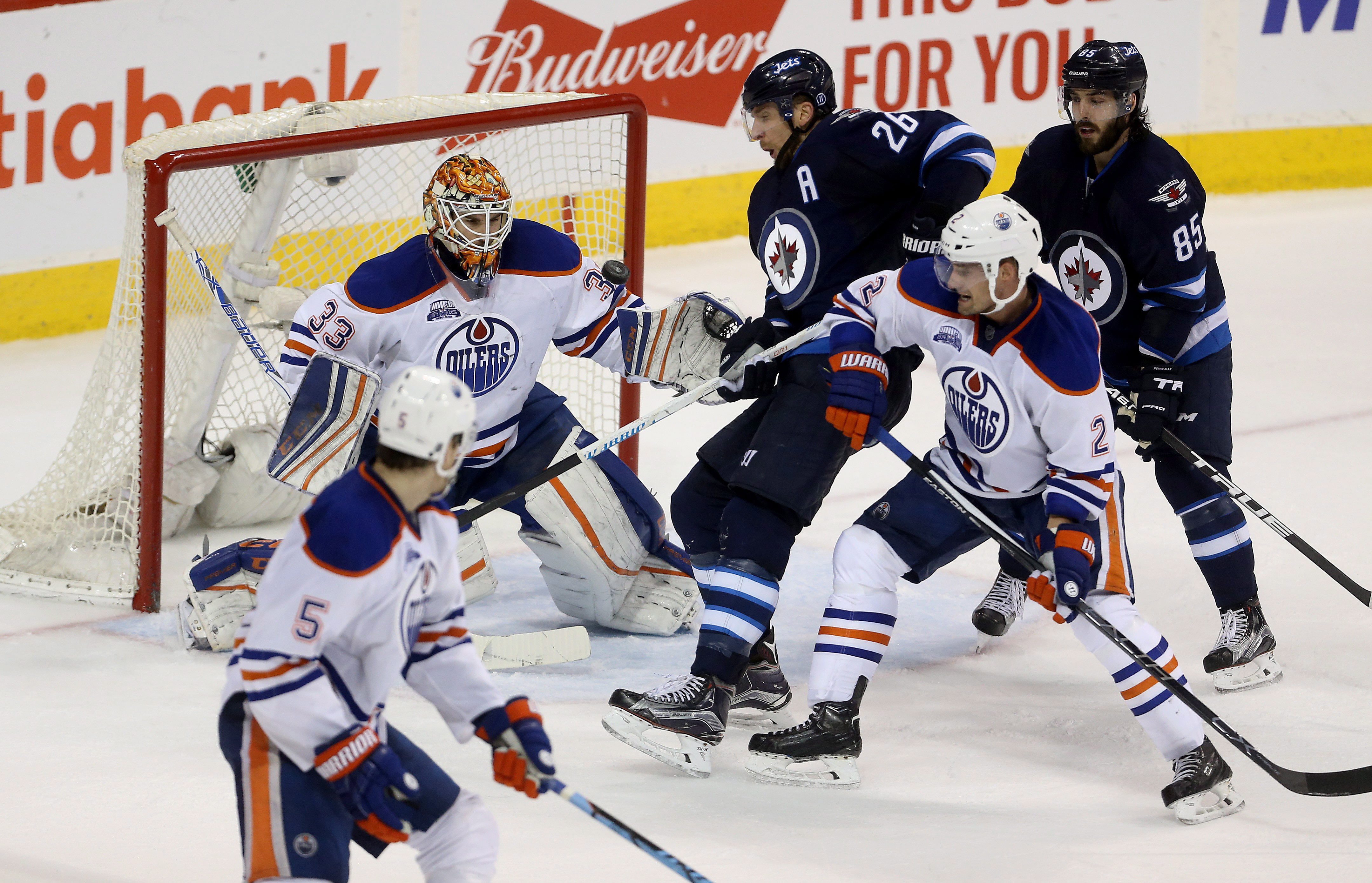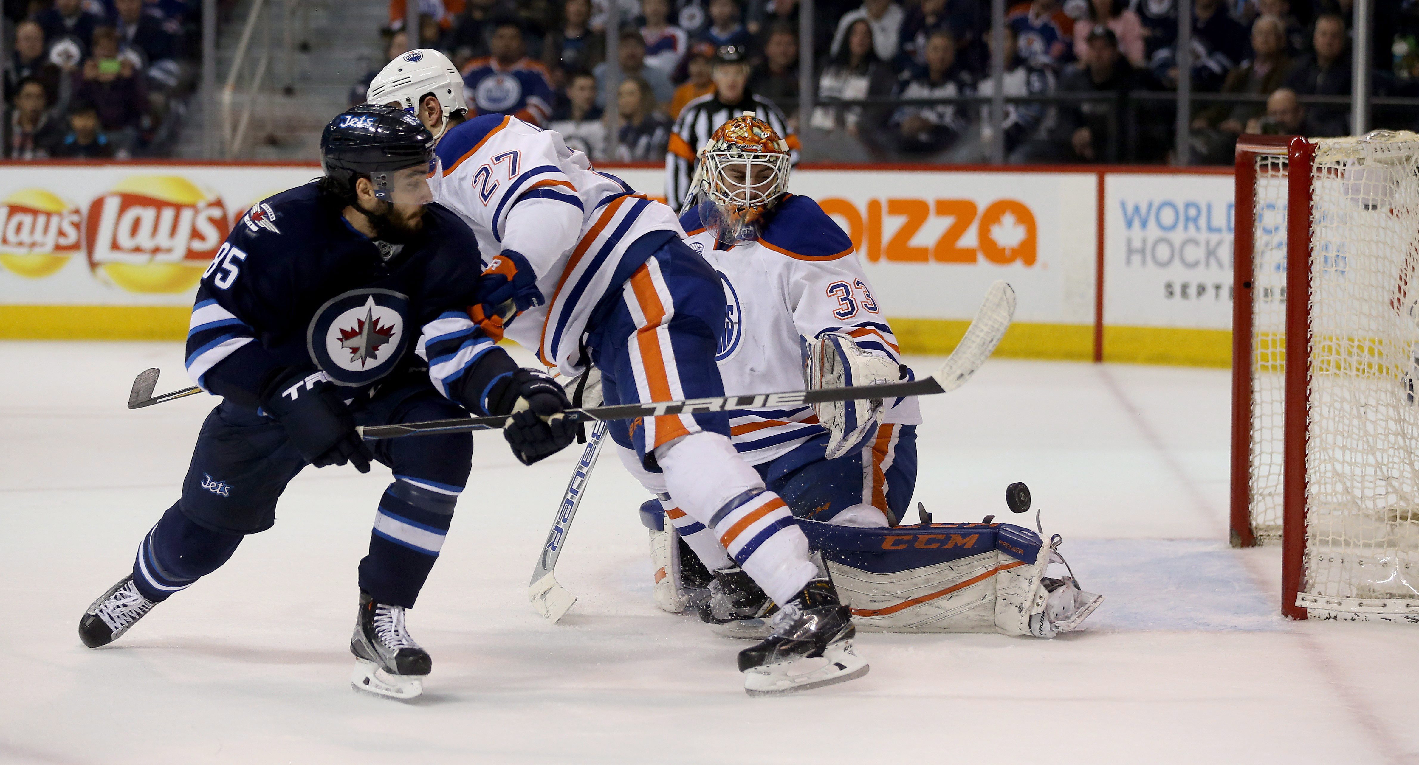 Taylor Hall, working behind the goal line in Winnipeg’s zone, found Maroon on Pavelec’s doorstep and Maroon fired home his sixth of the season for the 1-0 lead at 5:25.