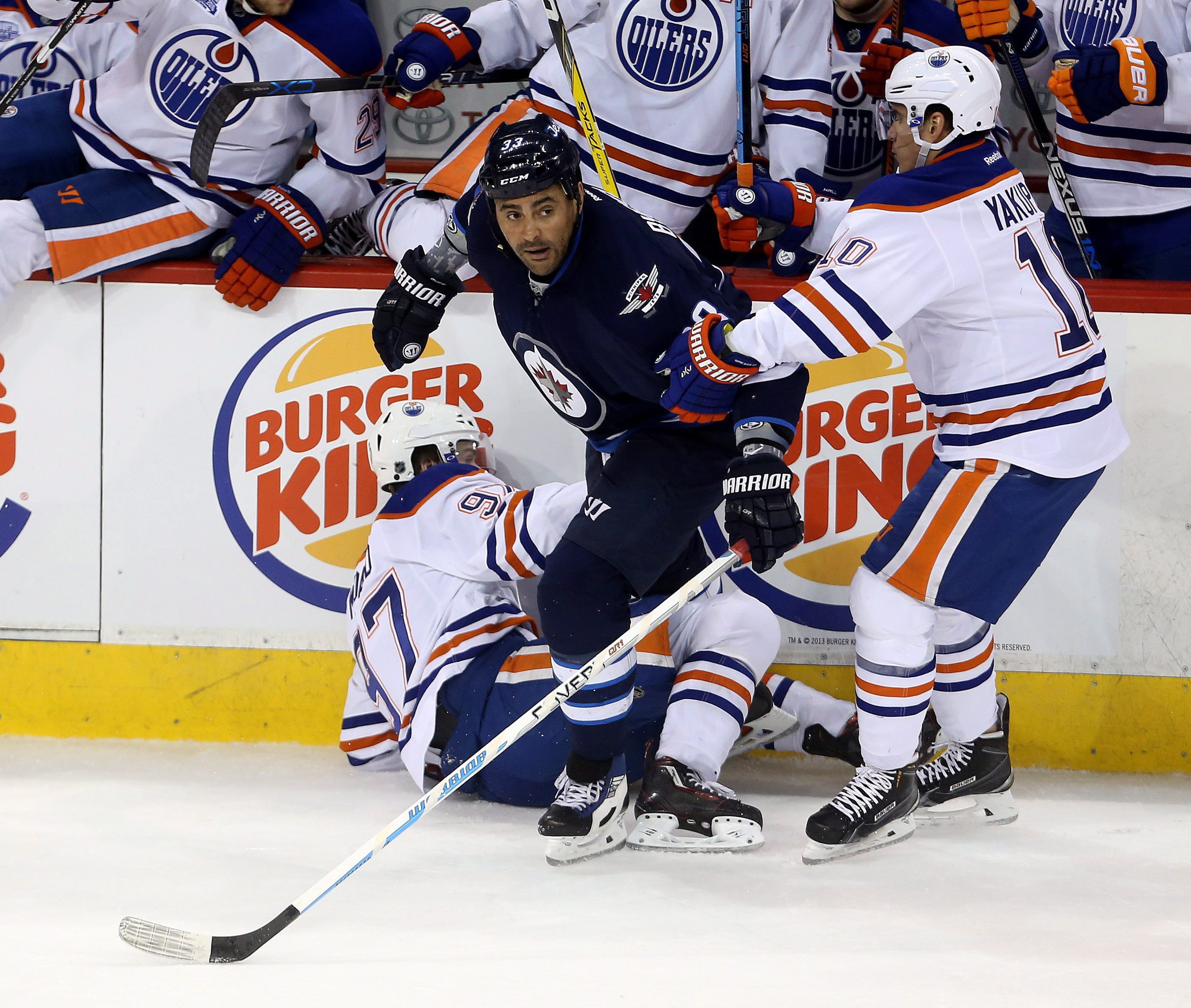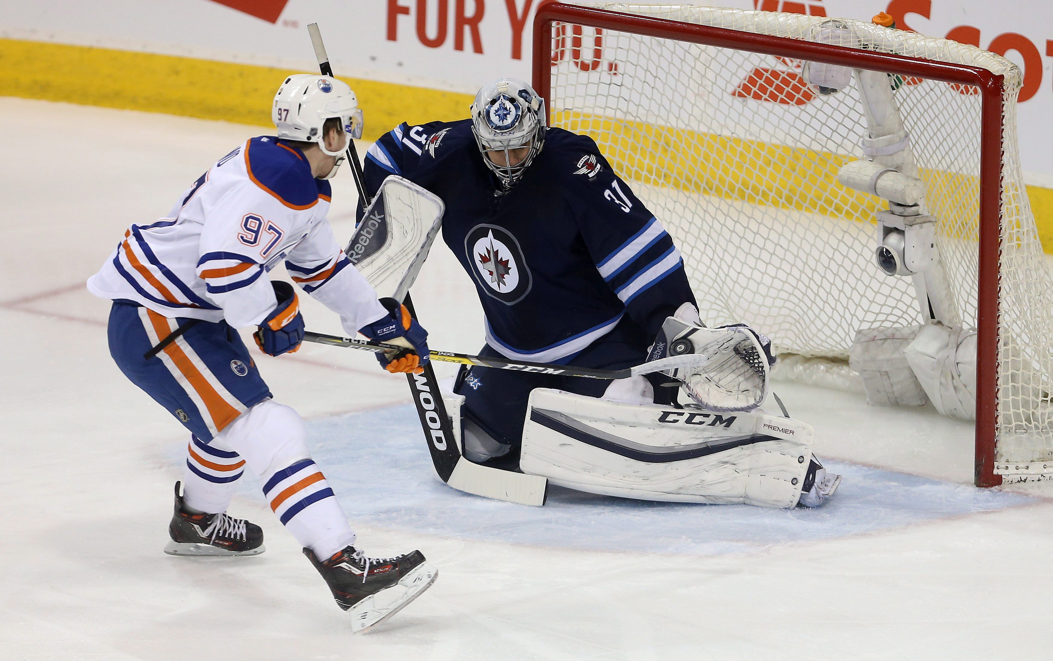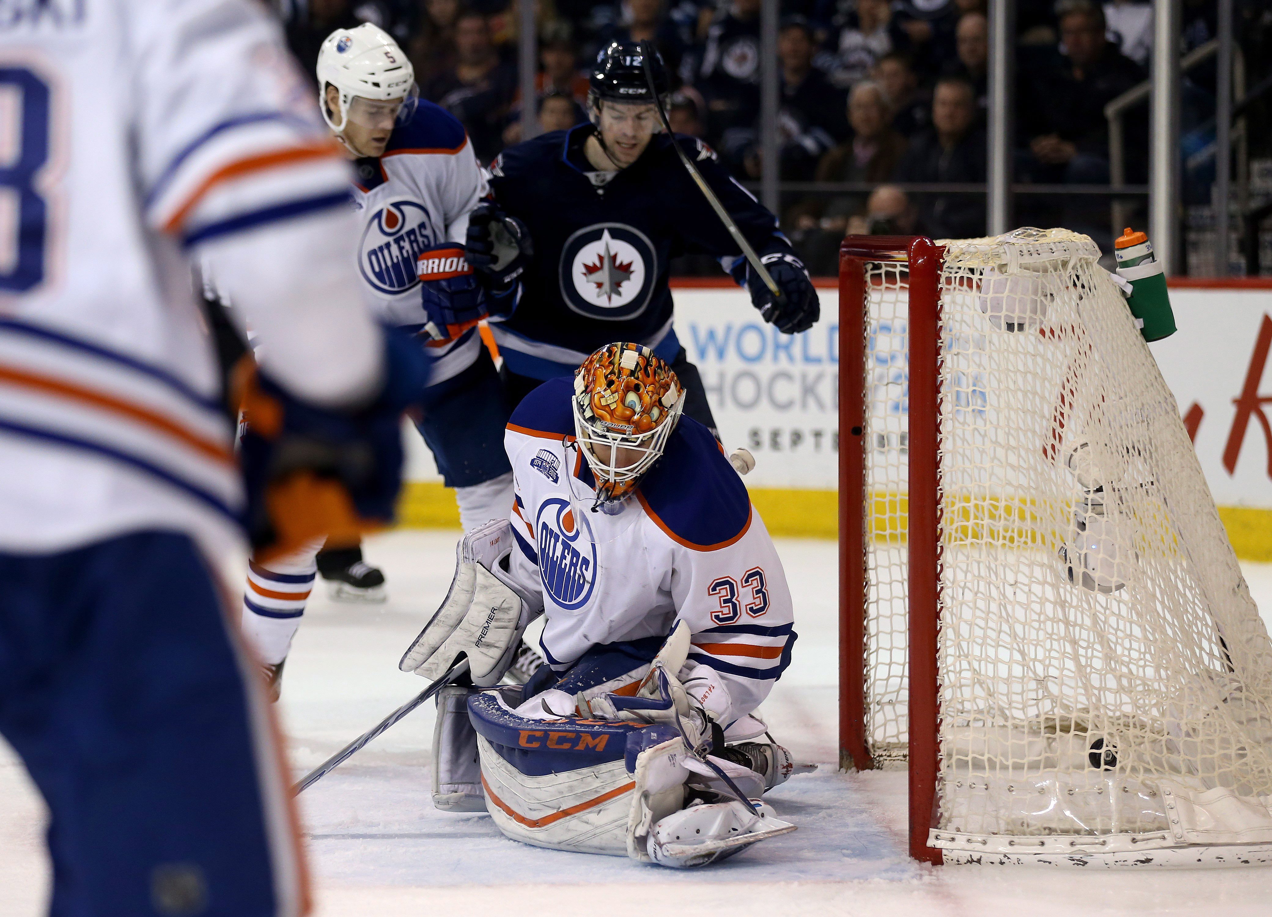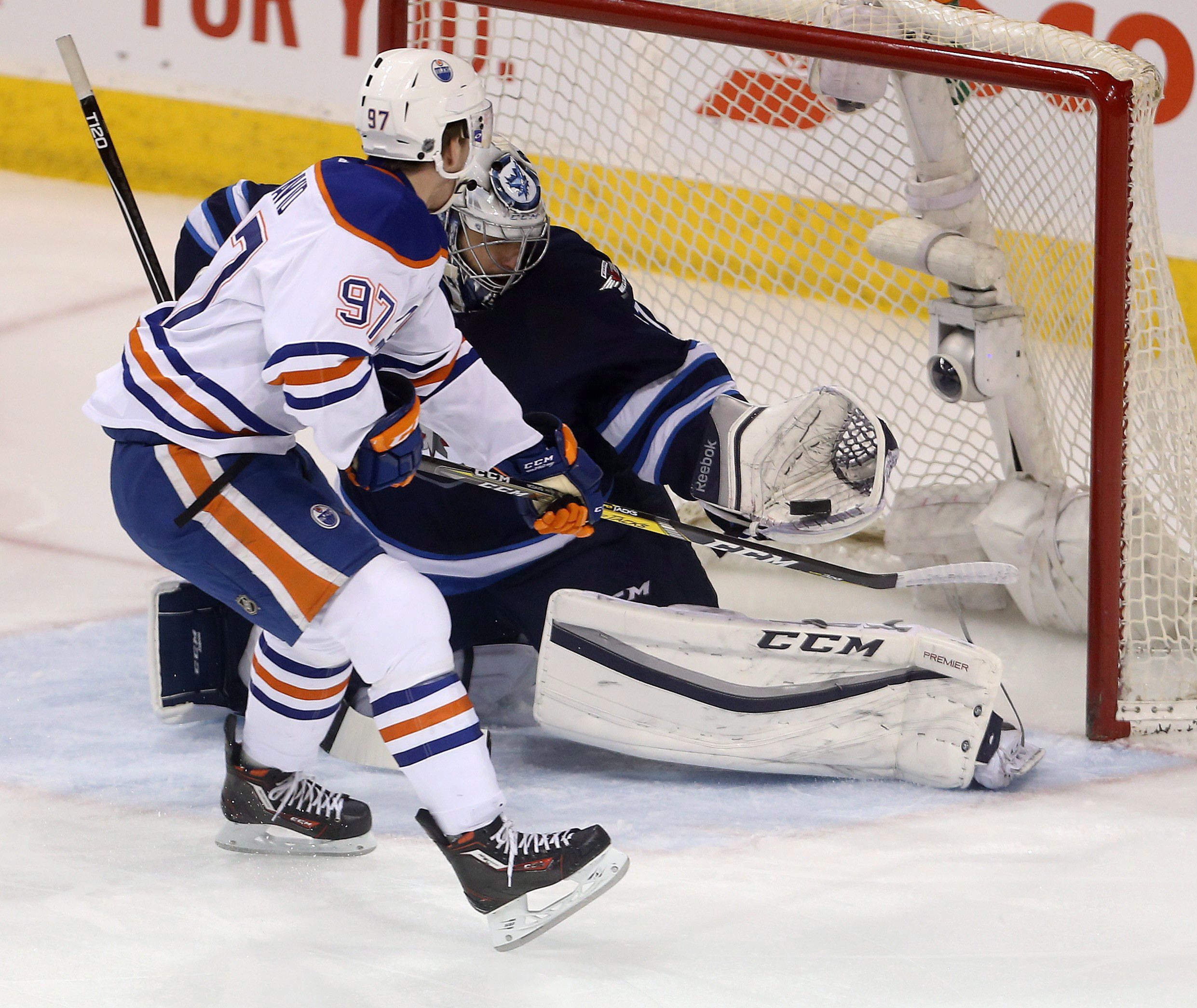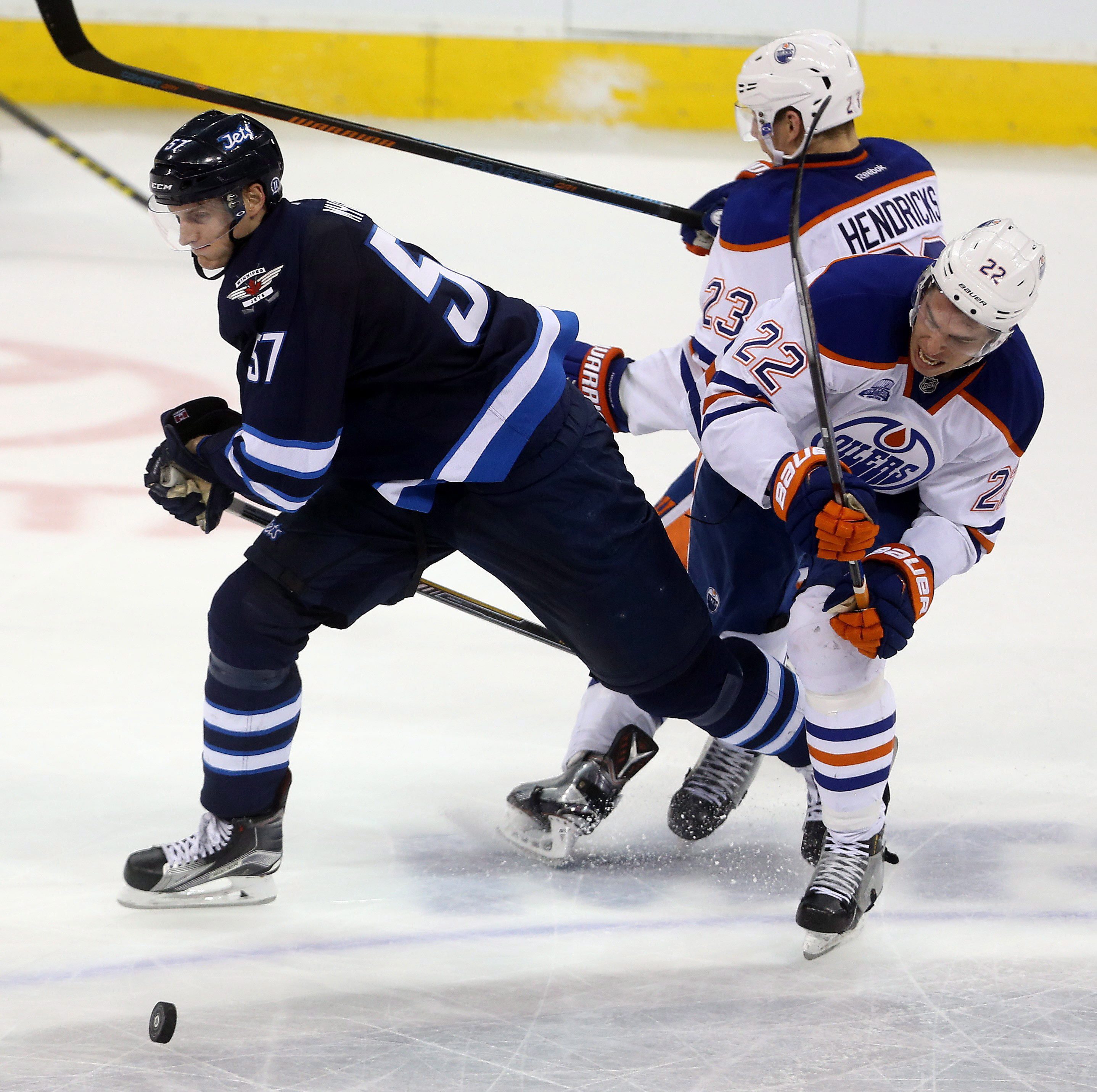 Taylor Hall, working behind the goal line in Winnipeg’s zone, found Maroon on Pavelec’s doorstep and Maroon fired home his sixth of the season for the 1-0 lead at 5:25.