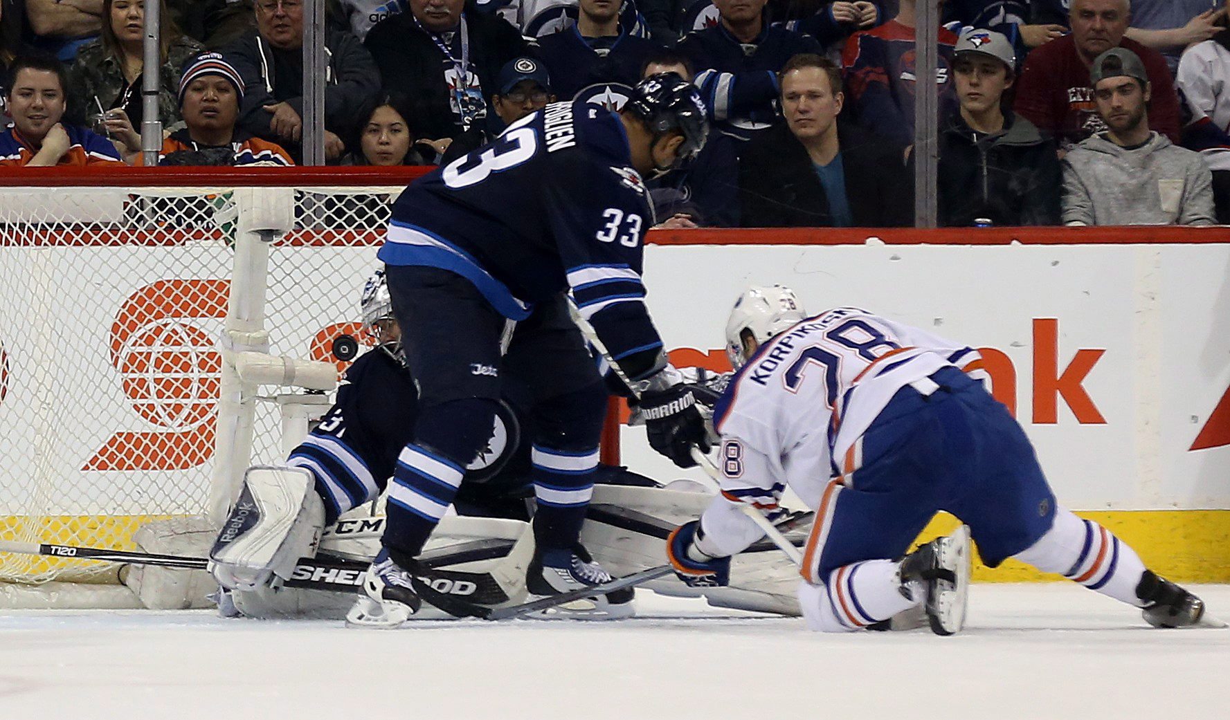 Andrej Sekera made a slick move to funnel down toward the Winnipeg goal and found Korpikoski, who on one knee jammed home a loose puck in the slot for the 2-1 lead at 16:20.