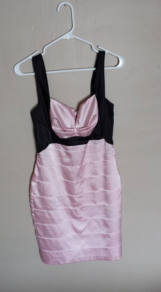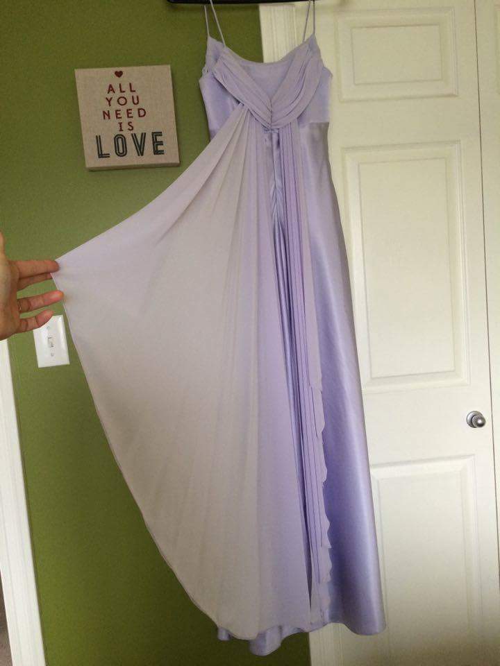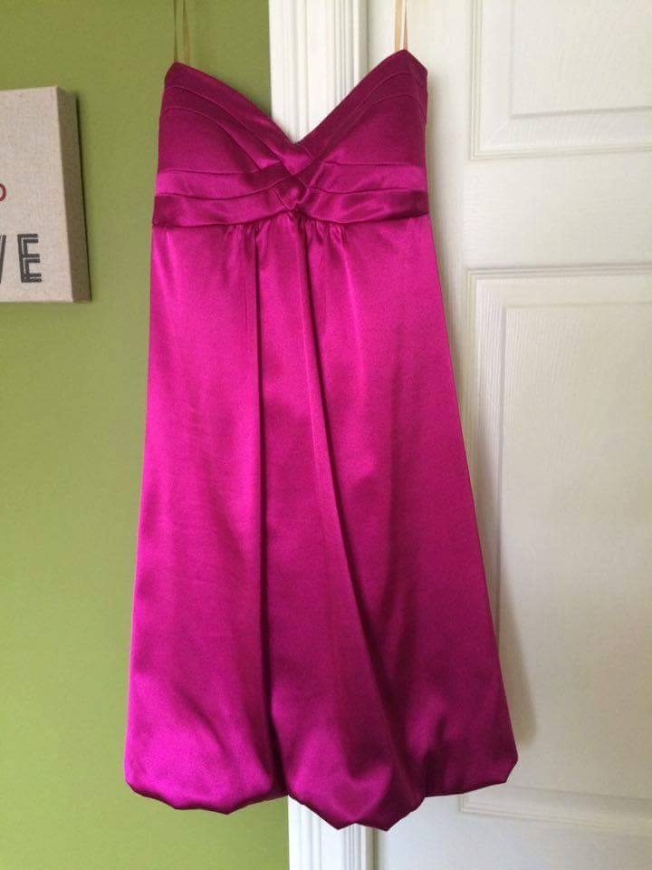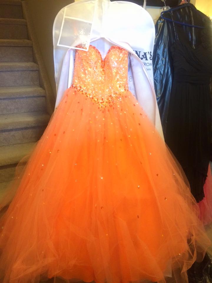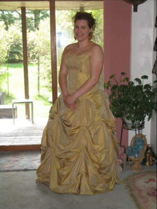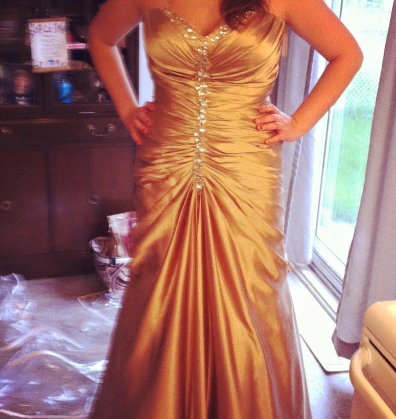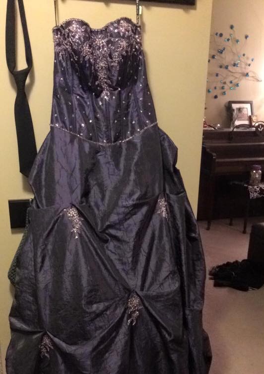 They range from princess ball gowns to sleek sheaths. There’s a coral tulle number dotted with gems; a golden gown with an embroidered halter top and ruching throughout the skirt; even a short purple satin and black lace dress that was originally worn in a wedding party.