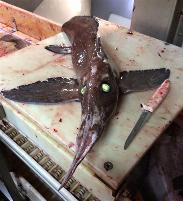 Hebda said it’s not surprising the fishermen were stumped by the fish, given that chimeras are rarely seen or caught. Also known as “rat fish,” they typically live between 2,000 and 3,000 metres down into the ocean, trolling along the sea floor looking for crustaceans and worms to eat.