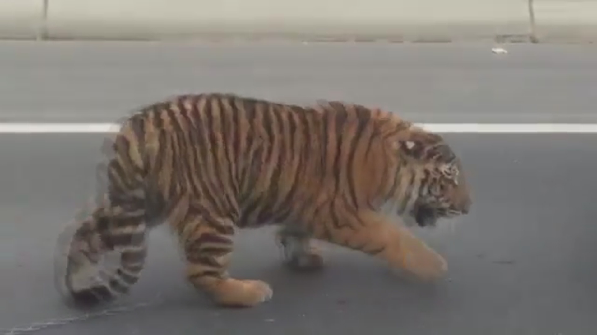 A driver captured video of a young tiger appearing to fall from the back of a truck onto the roadway.