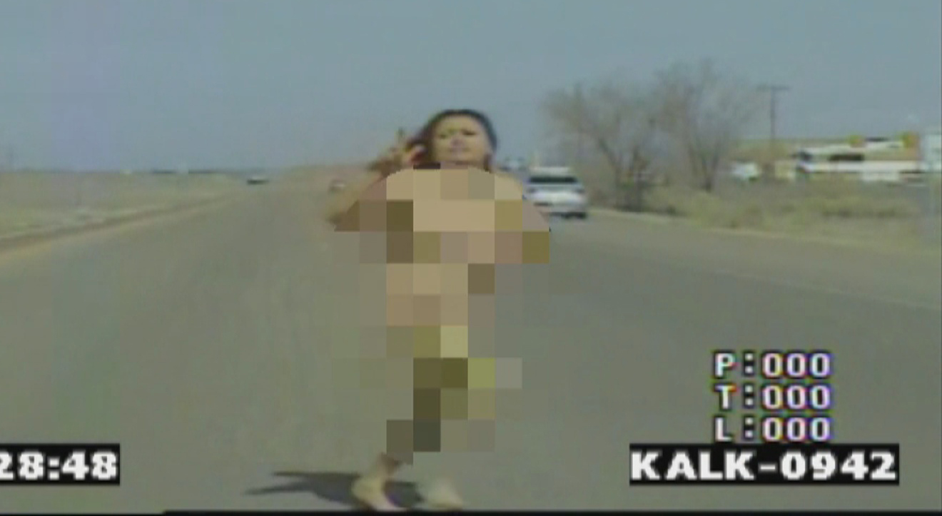 As police approach, the camera captures the naked woman exit her car and begin running across the freeway, yelling at police as she crosses in front of a deputy’s cruiser.