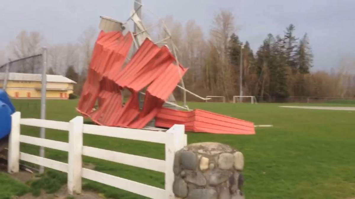At Pitt Meadows Airport, a Cessna 150 flipped over on the tarmac due to the strong winds, even though it was tied down.