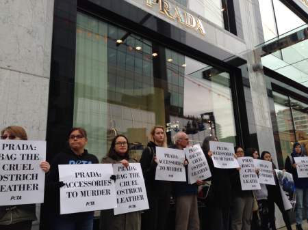 About a dozen animal rights activists gathered outside Prada’s flagship store in Vancouver this afternoon to protest the company’s treatment of ostriches.