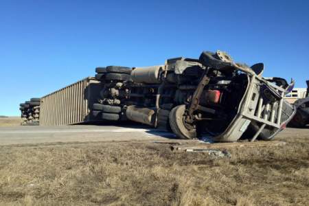 An overturned semi is blocking the southbound lanes of Highway 11 following a collision. Dayne Winter / Global News
