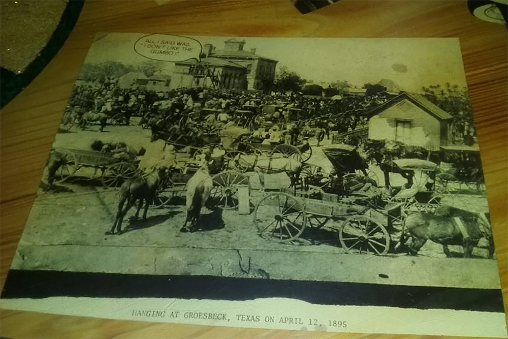 The photo appears to show a crowd of white people watching one or two black men being hanged with a caption with a cartoon bubble which says, “All I said was ‘I didn’t like the gumbo.'”