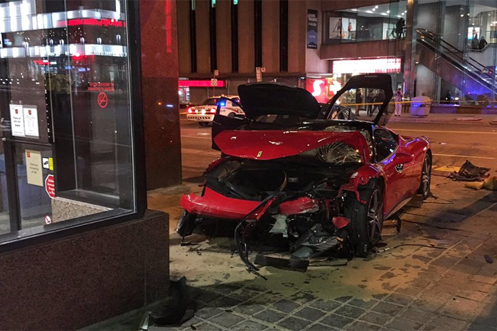 One of the vehicles, a Ferrari, struck the CIBC bank branch on the southeast corner.