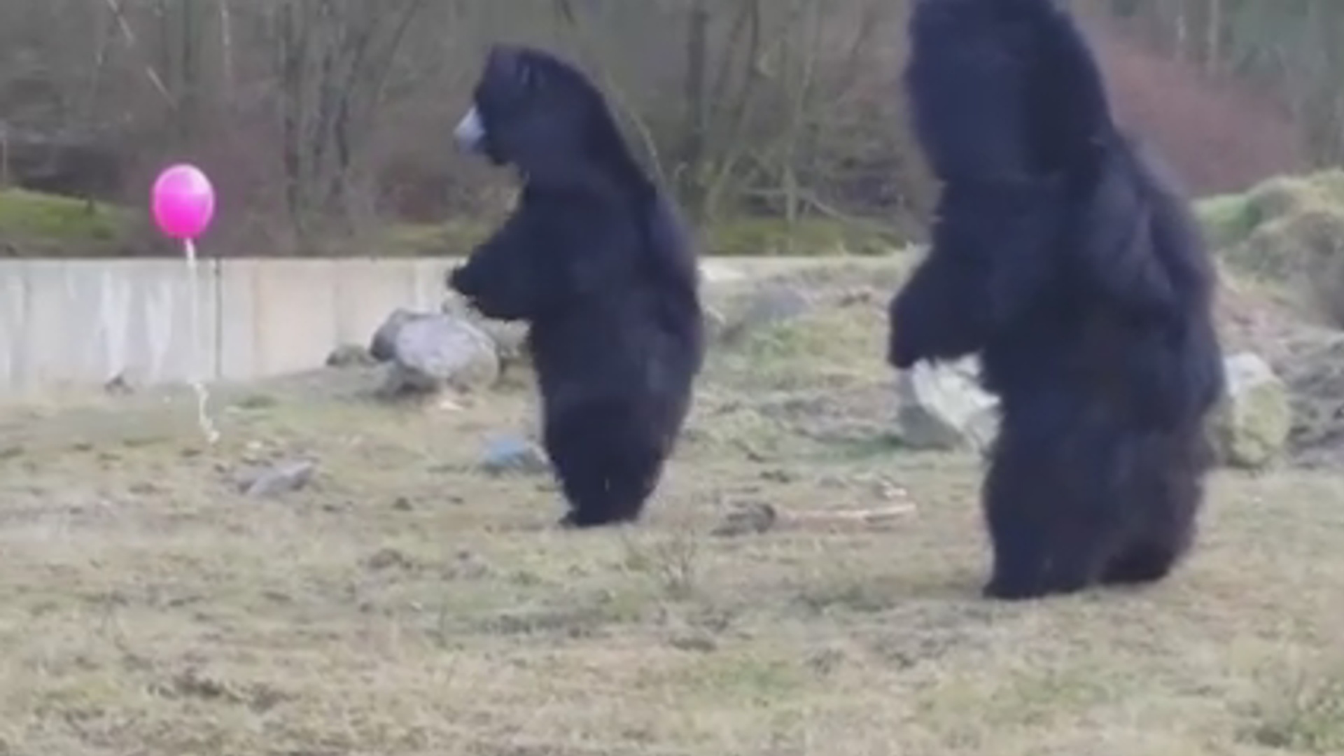 A group of bears got a pleasant surprise when a bright pink balloon floated into their enclosure.
