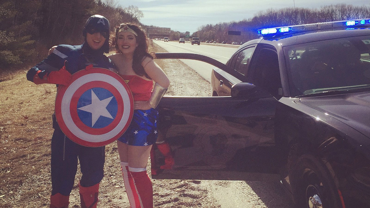 Stranded on an interstate, the costumed duo was afraid of missing their gig and losing their jobs.