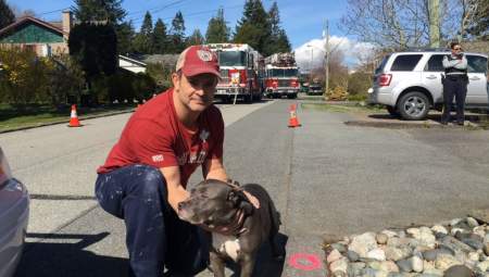 Ten-year-old Caddy, a female pit bull, is alive thanks to Burnaby firefighter Dillon Peters.