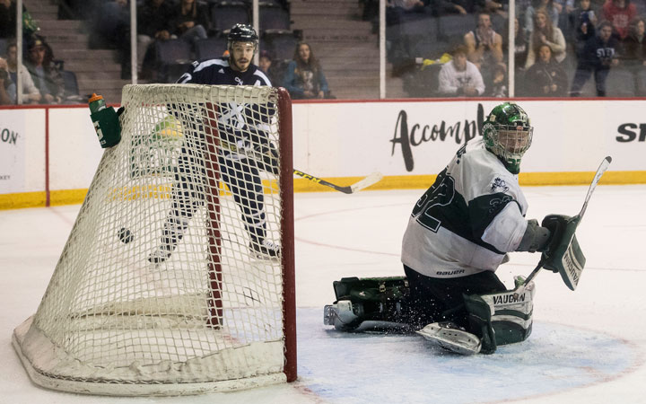 Clarke almost ended it seconds earlier on a nice deke against Saskatchewan’s Jordon Cooke, Canadian university’s top goalie this year, but the puck rolled off his stick. However the freshman forward admitted he wasn’t necessarily aiming for the top corner on his game-winning goal.