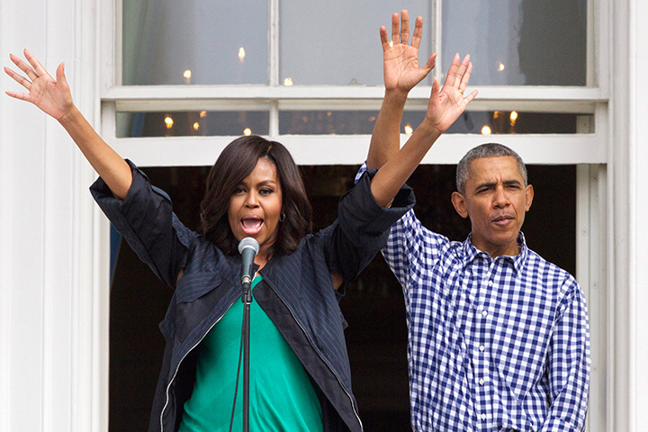 “I’m going to be running around the White House with a bunch of kids and any adults who feel like they can hang,” the first lady told the crowd as the president jokingly signalled in the background that the run wasn’t for him.