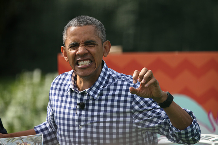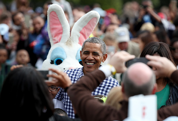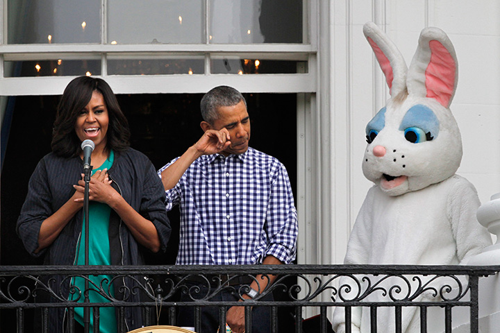 The Obamas spoke from a balcony that overlooks the lawn with dogs Bo and Sunny and the Easter Bunny at their side. They then went out into the crowd for some hands-on play. The president read the children’s book, “Where the Wild Things Are,” a classic from 1963, and the Obamas acted some of the story out, marching enthusiastically with the kids as he read the line “let the wild rumpus start!”