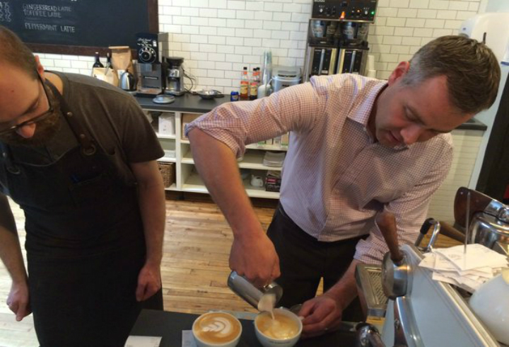 Behind the counter at Common Cafe, Broten took a stab at being barista, attempting to replicate the coffee shop’s latte art, with little success.