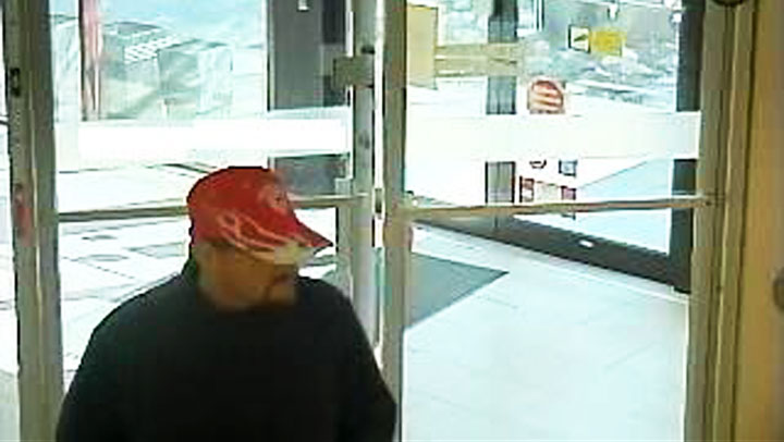 The man in both robberies was wearing checkered sweat-style pants, a dark coloured jacket, and a red ball cap with a logo on the top.