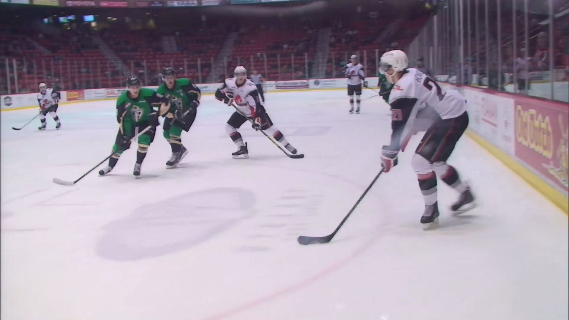 Rylan Parenteau started in net for the Raiders but was pulled after allowing four goals on 21 shots in 27:25 of action. Ian Scott turned away 12-of-15 shots in relief.