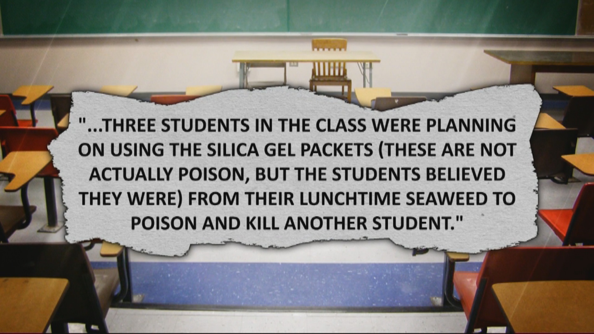 The note from the school read, “Three students in the class were planning on using the silica gel packets (these are not actually poison, but the students believed they were) from their lunchtime seaweed to poison and kill another student.”