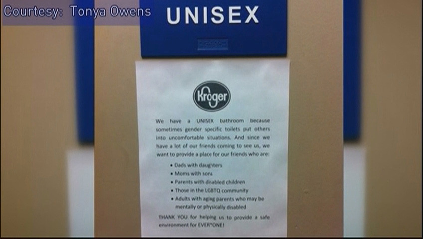 A message attached to a unisex washroom sign at a Krogers Marketplace in Athens, GA has gone viral.