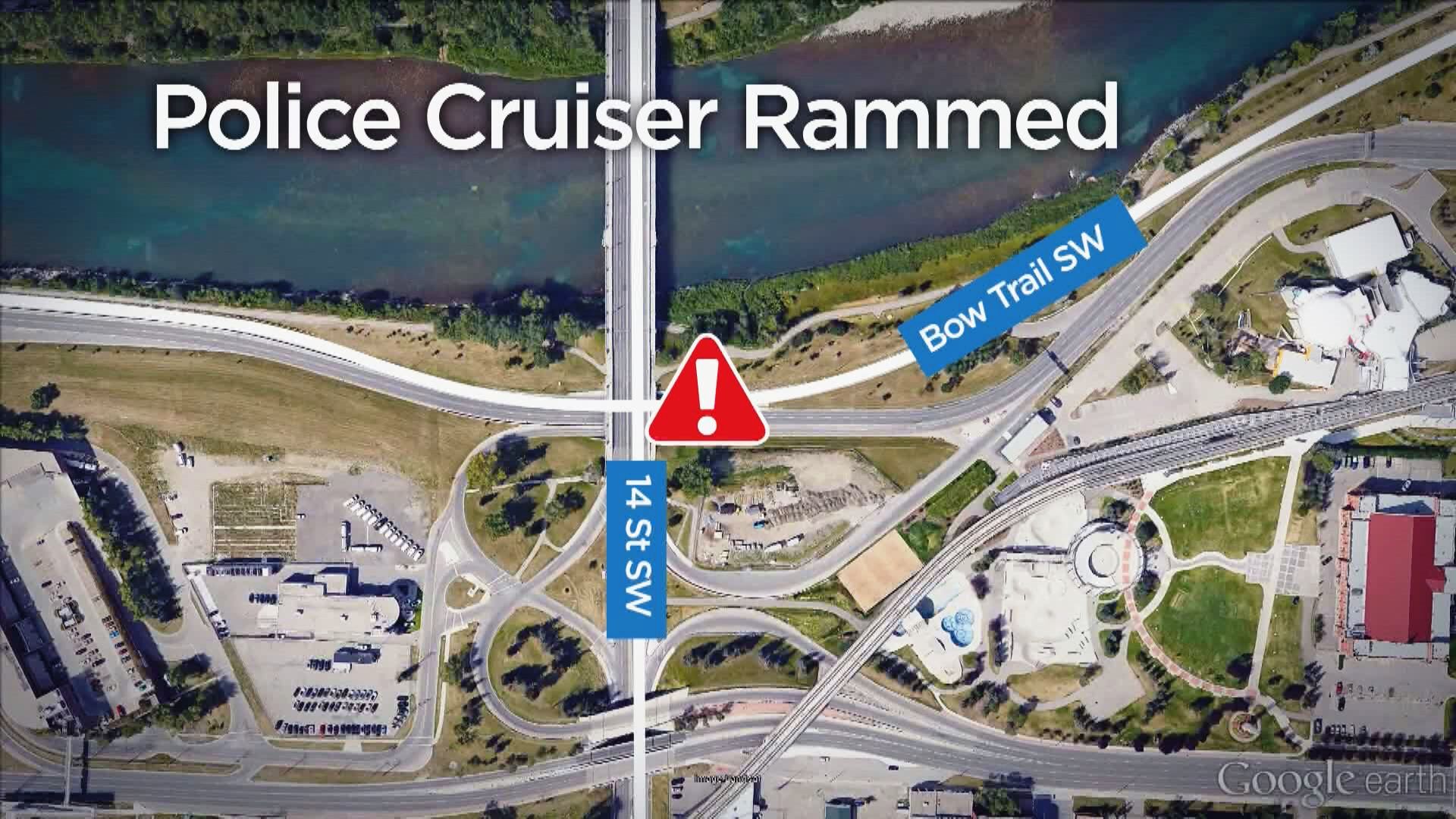 Eventually, the vehicle was tracked to Bow Trail S.W., where it rammed a police cruiser before speeding off.