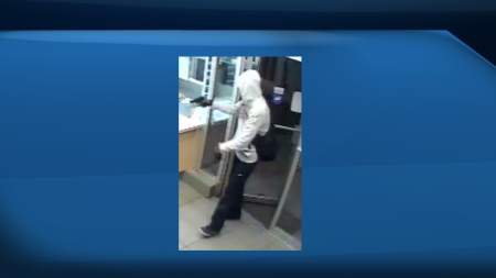 The suspect is described as being in his mid-20s and about 5’11” tall. He was wearing a white hoodie with white and red writing on the front and shoulders, a red bandana, black pants, grey and black gloves and black skater-style shoes with white soles.