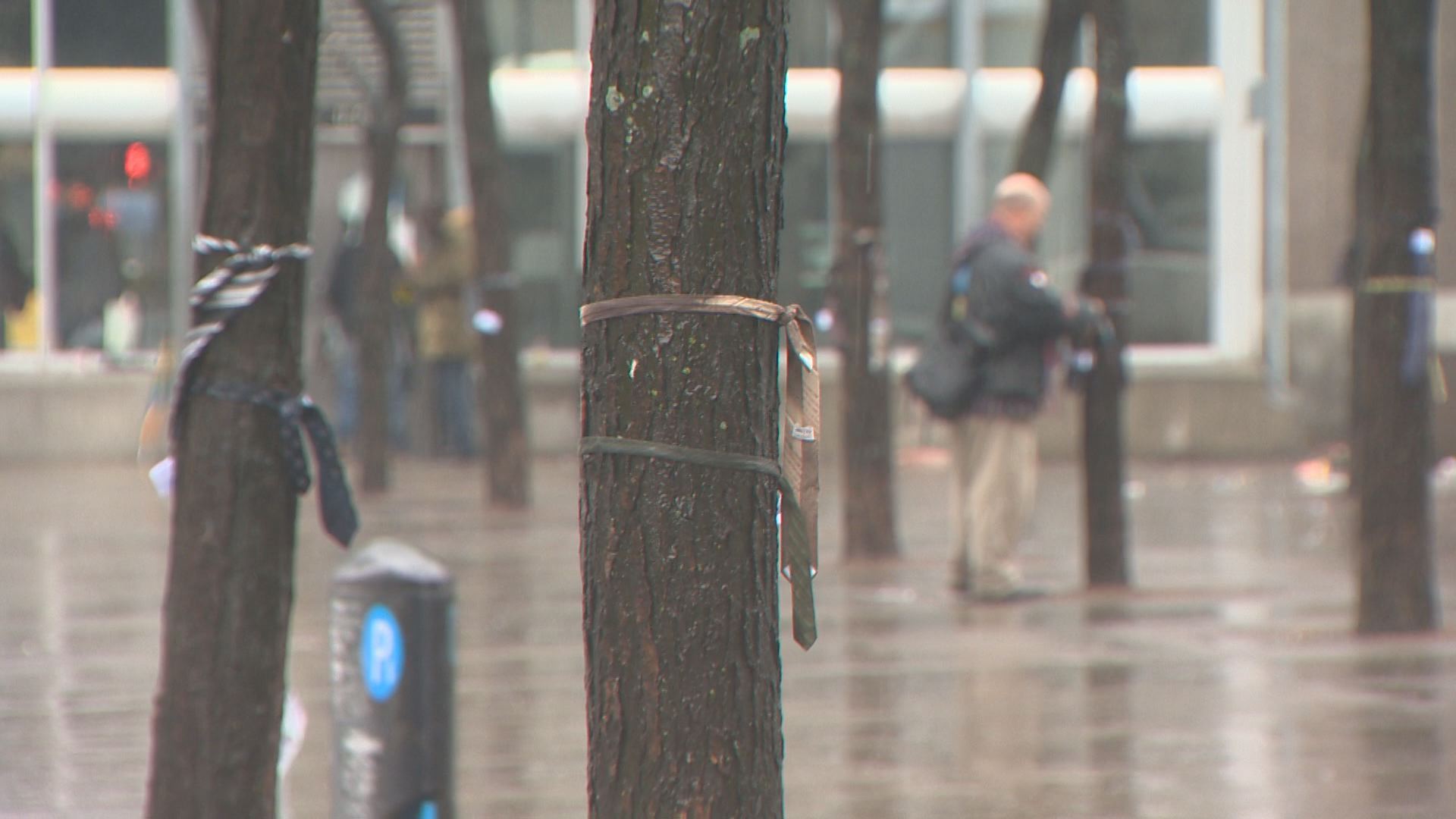 MONTREAL – Tied around the trunk of a tree at Parc Émilie-Gamelin Thursday hangs a necktie, soaked in the pouring rain.