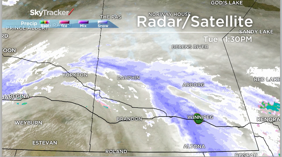 This snow is coming ahead of an Alberta Clipper currently over southern Saskatchewan. Snow started Tuesday morning and is expected to continue through the day before ending in the evening.