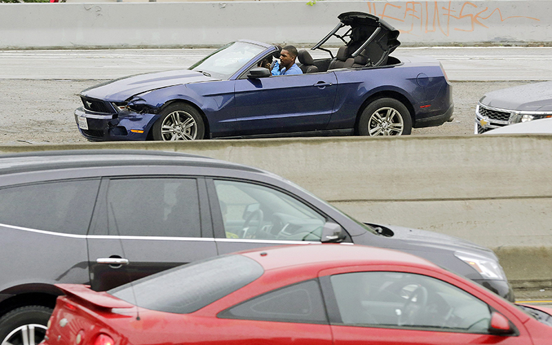 Shortly after 3 p.m., the car – riding on three tires by this time – pulled up on a South Los Angeles street where a group of mainly young men were standing near a driveway. The driver got out and sat on the hood. Both men took selfies and exchanged hugs, high-fives and conversation with the group of apparent friends or well-wishers.