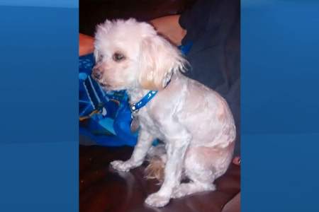The dog is 15 years old, weighs 4 to 5 pounds and was wearing a red multi-coloured sweater with a blue collar and brown leash.