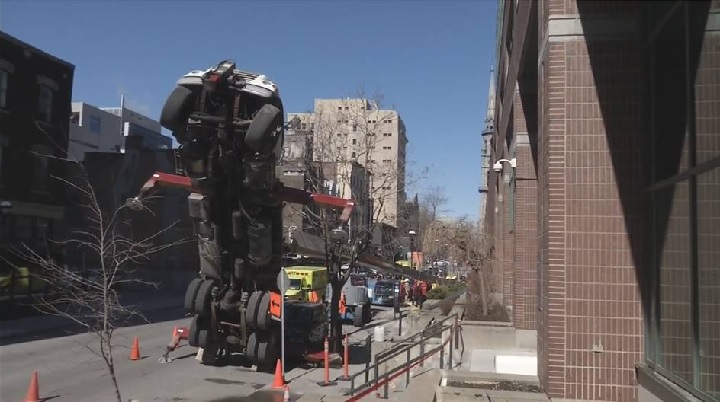 The crane was operating on the corner of Saint-Denis Street and René-Levesque Boulevard at the time of the incident.