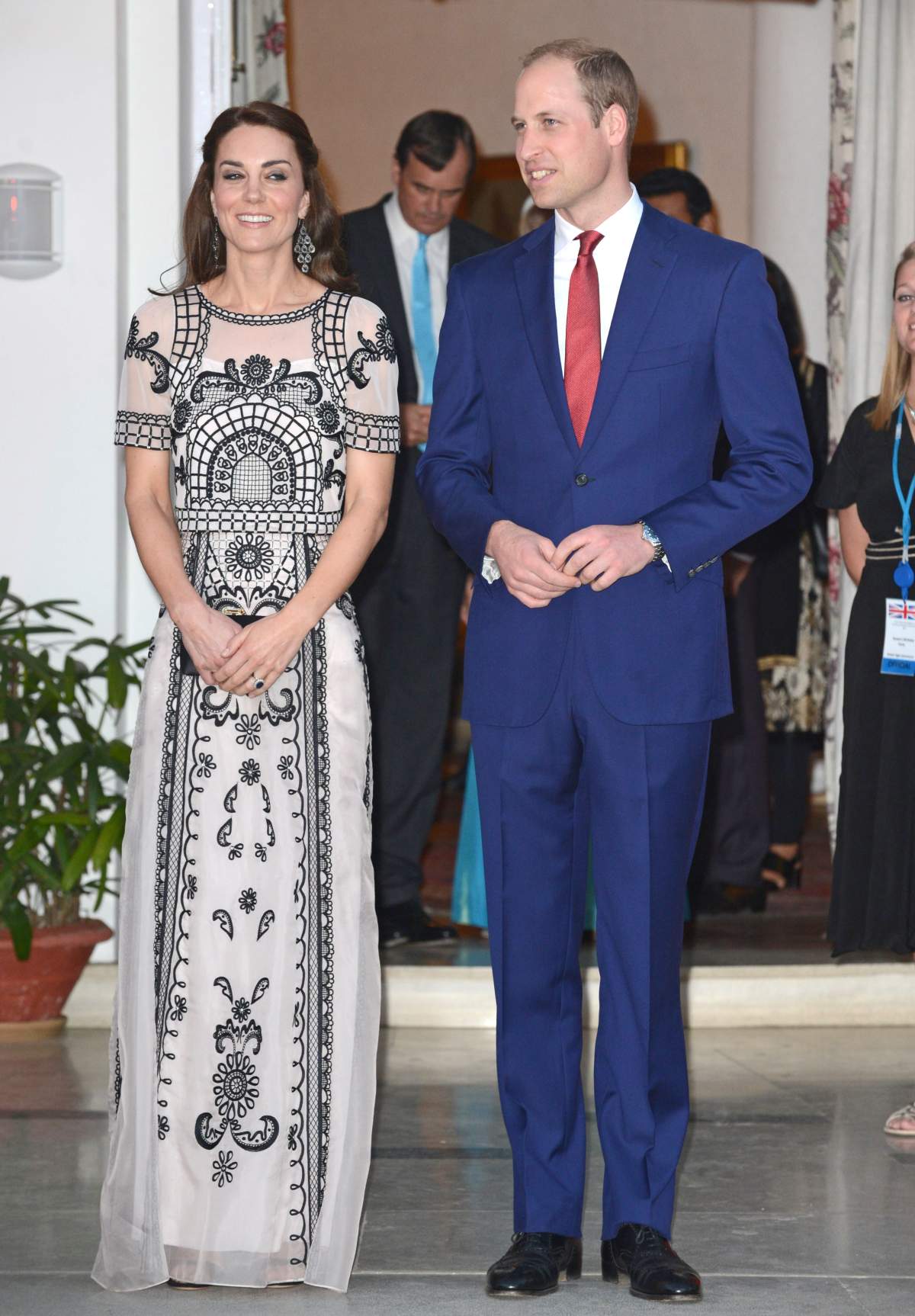 Before going indoors, Prince William and his wife, the former Kate Middleton, strolled on either side of Prime Minister Narendra Modi. They were seen chatting and smiling, before posing for cameras. Kate wore a full-sleeved gauze green dress, while William donned a blue suit and Modi was clad neck-to-toe in white.
