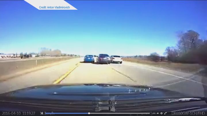 In a video posted by Anton Vladimirovich, a car can be seen driving in the right-hand lane of the highway. The car then swerves into the middle of the road, speeding between two cars instead of passing safely.