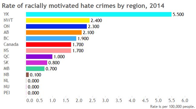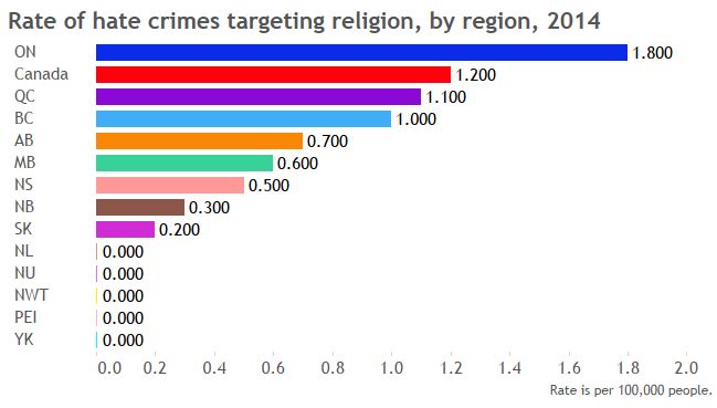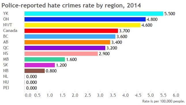 The hate crime rate across Canada is 3.7 per 100,000 people. But that varies from province to province: Ontario is the highest, with 4.8 hate crimes per 100,000 people.