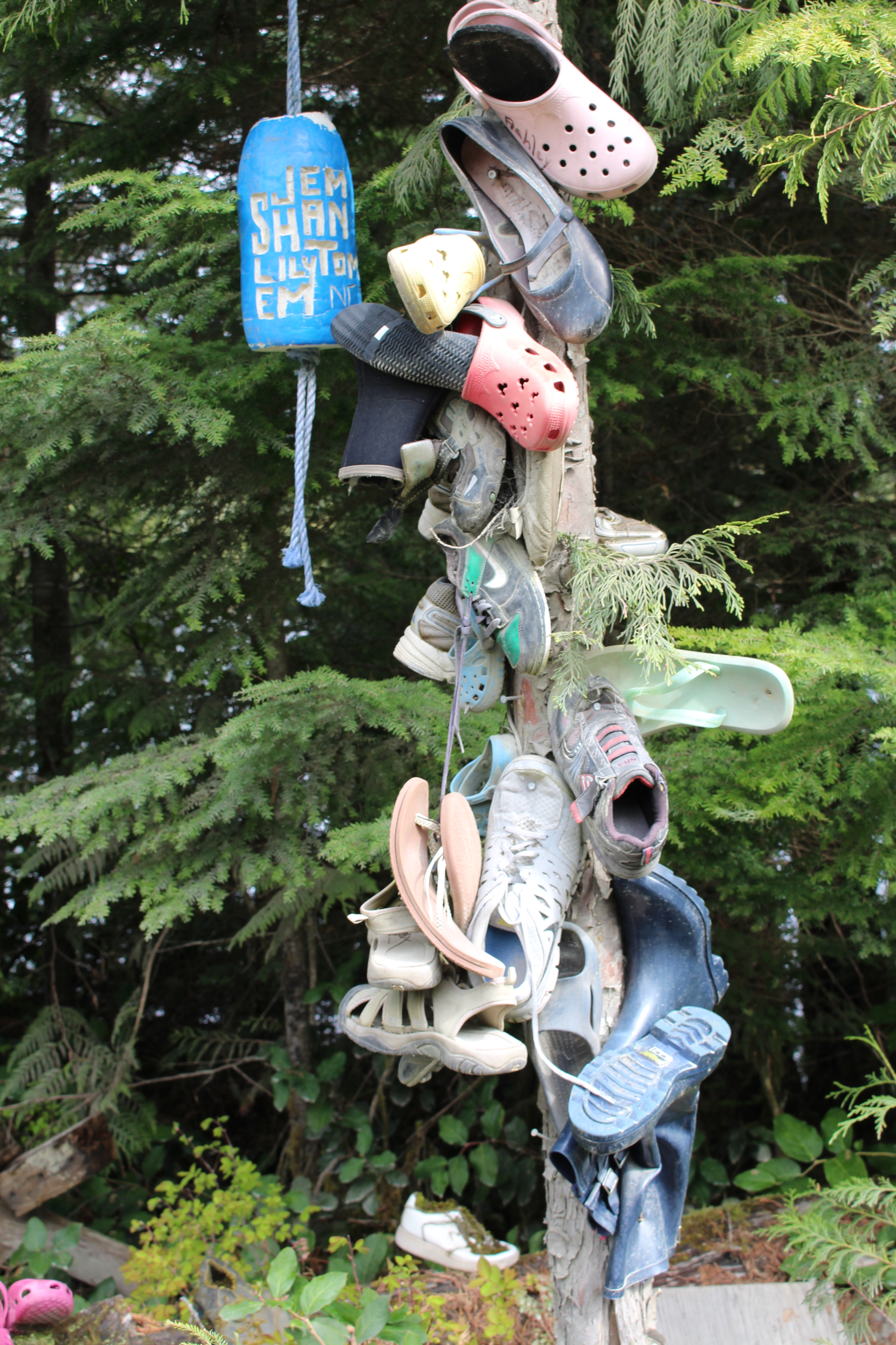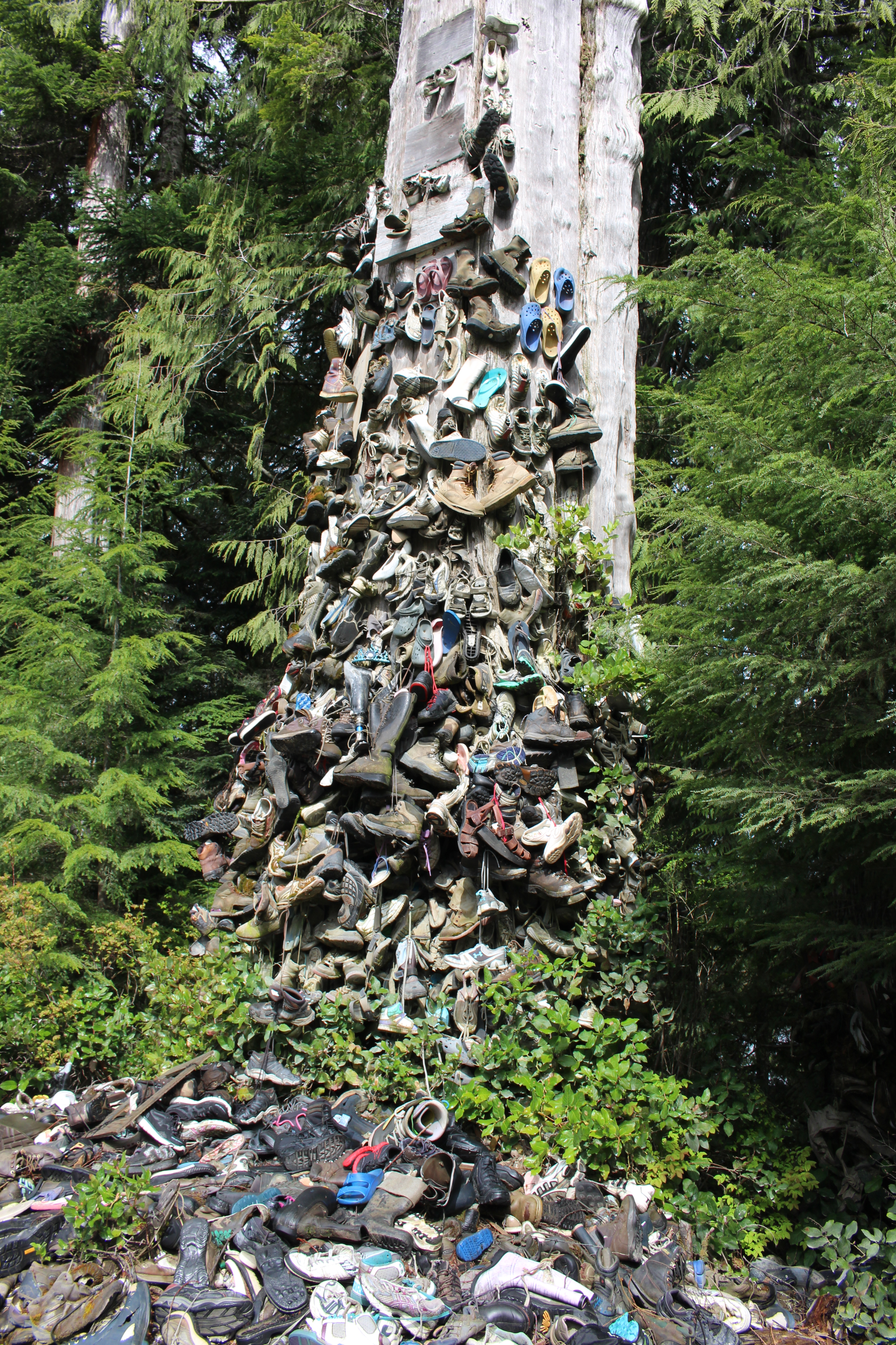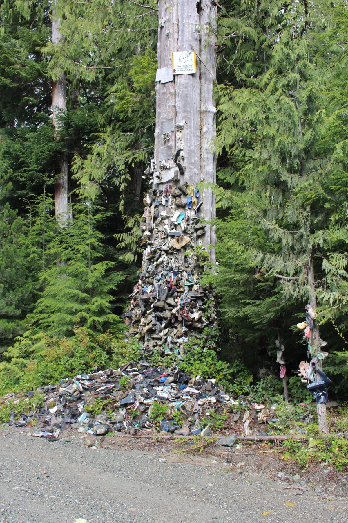 A short drive from Port Hardy, on the way to the town of Holberg, is the Shoe Tree. The old cedar tree is covered with hundreds of shoes put there by hikers. It is believed to have been started as a joke in the 1970s.