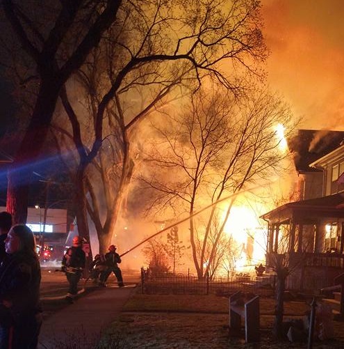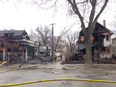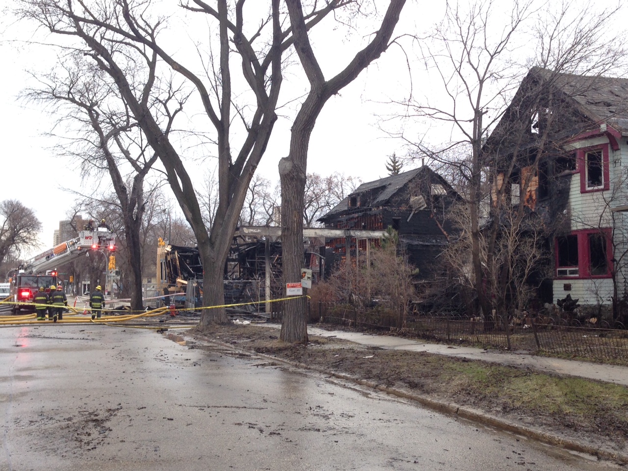 WINNIPEG – Four firefighters were injured in a large fire that badly damaged several buildings in the Wolseley area.