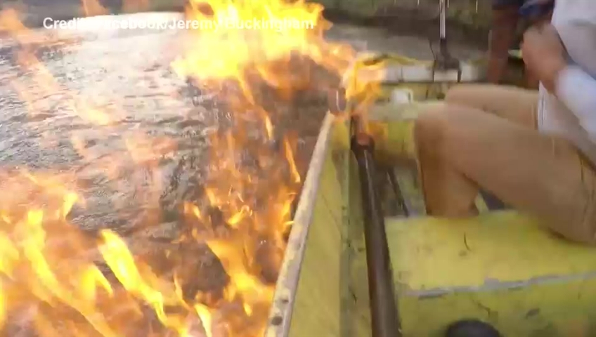 The exact moment Buckingham lights his lighter above a gas seep, a section of river immediately caught on fire forcing Buckingham to jump to the other side of the boat – while using an appropriate expletive anyone would use if a wall of flames was about to engulf you.