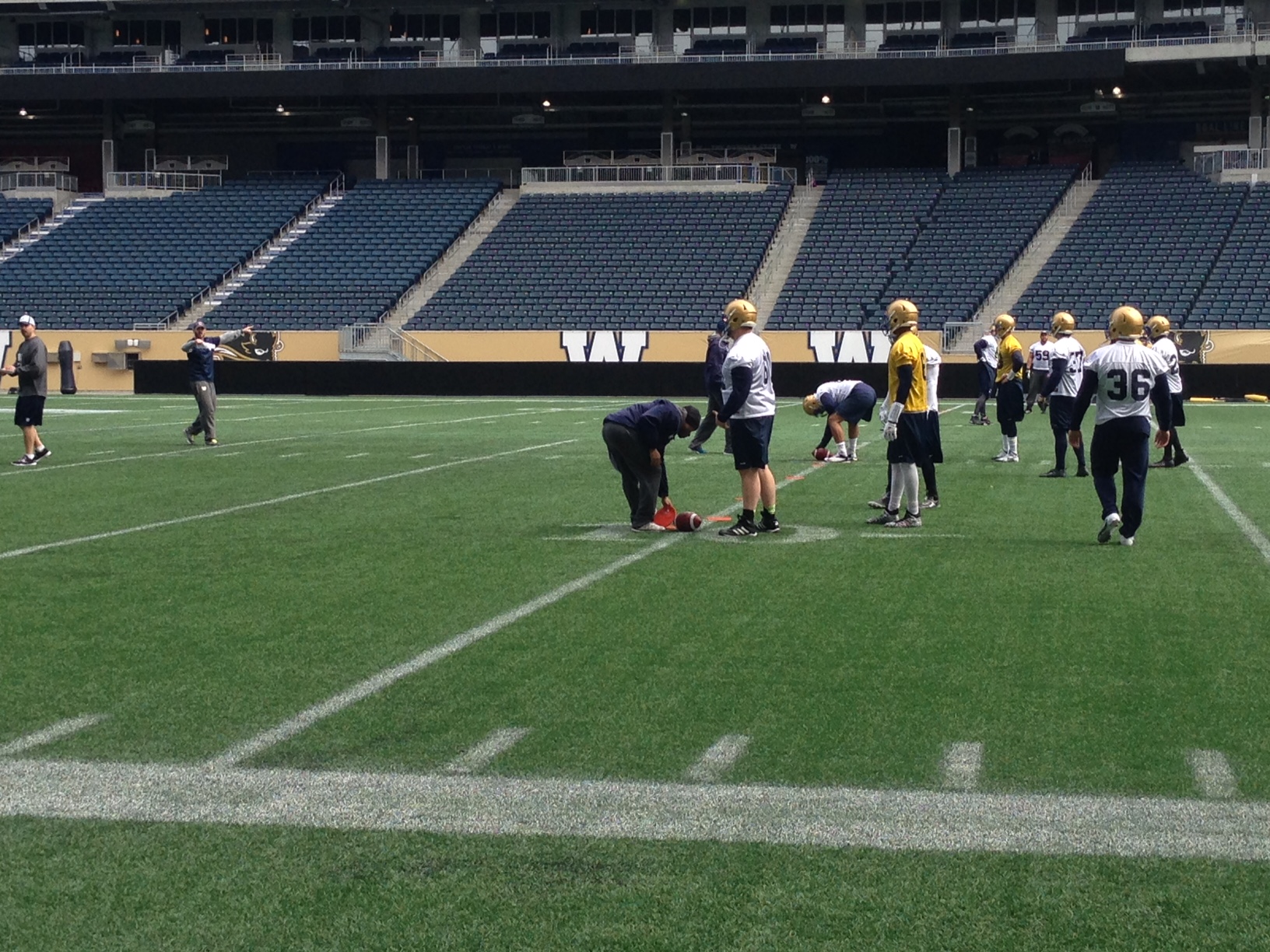 WINNIPEG – Fans of the Winnipeg Blue Bombers got an early taste of football as the club opened their three day mini-camp at Investors Group Field on Monday. The camp is strictly for players on offense as the team puts Paul Lapolice’s new playbook to the test.