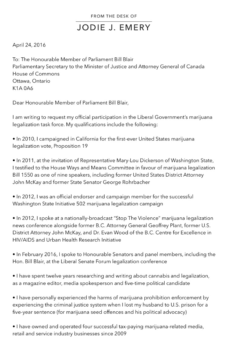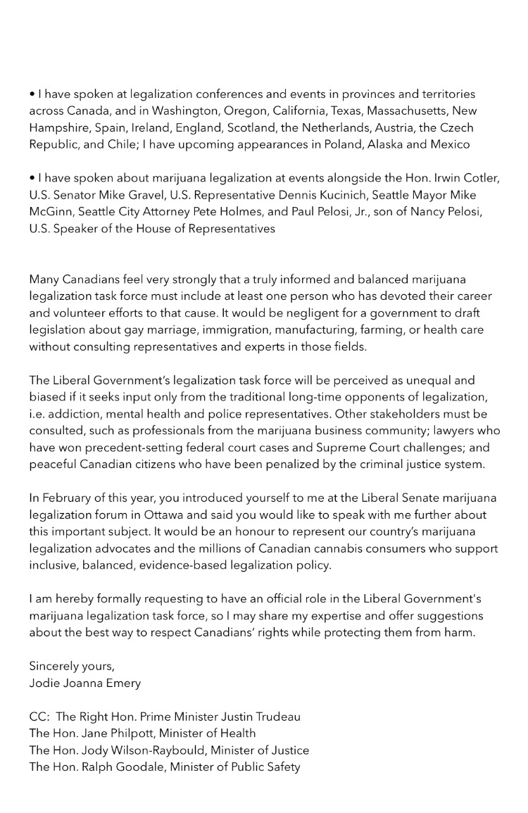 Longtime pot activist Jodie Emery has sent a letter to Philpott and other cabinet ministers as well Prime Minister Justin Trudeau requesting a spot on the task force.
