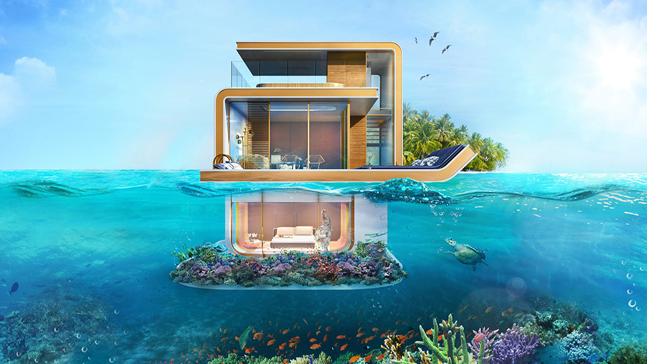 The floating villas, with underwater bedrooms, are a part of real estate agency Kleindienst Group’s “Heart of Europe” development within The World, a manmade archipelago in the Persian Gulf.