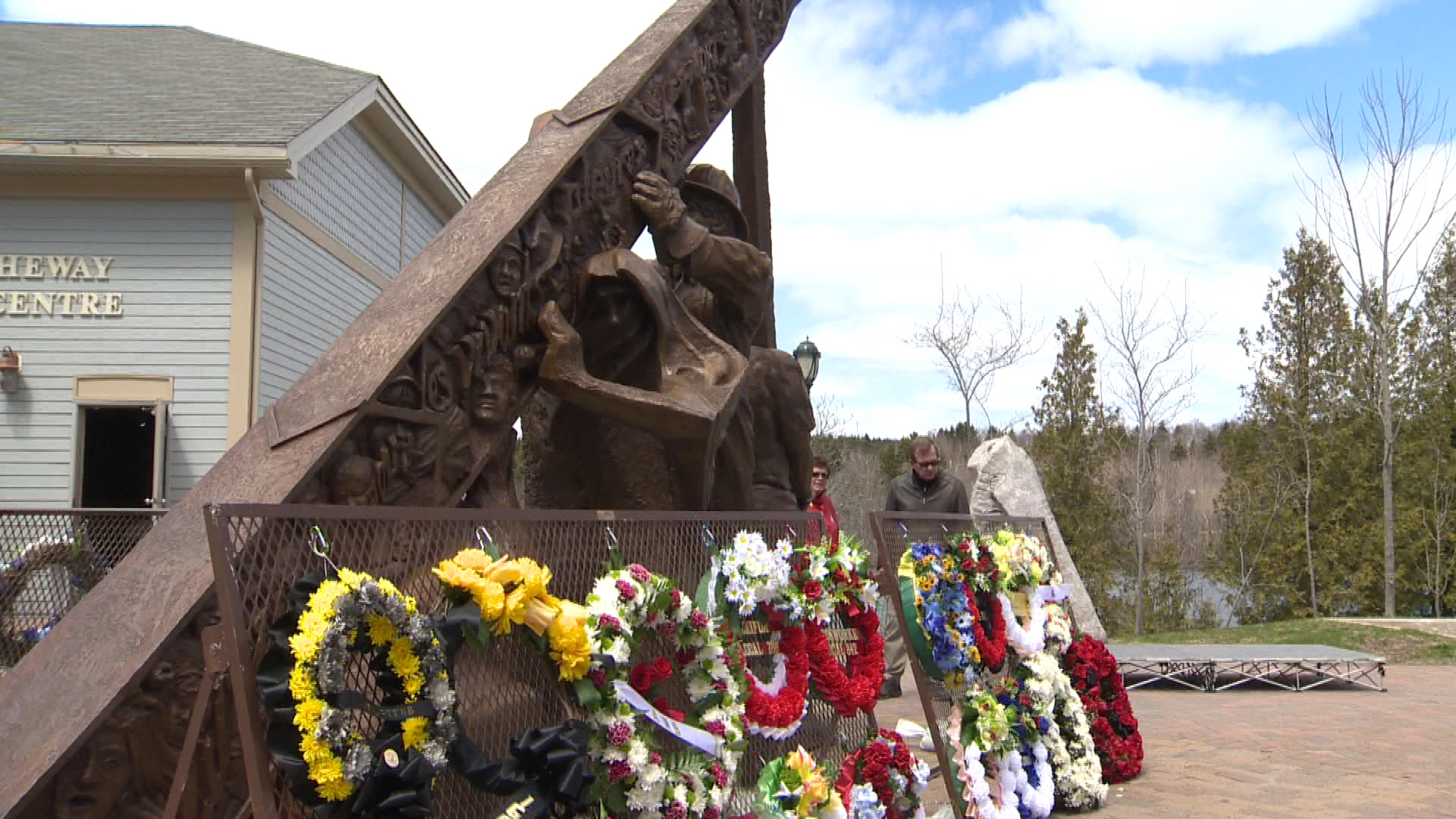 Wreaths were laid on a monument as an act of remembrance. Family members of Frankie “Freckles” Walsh, who drowned in an accident at the Port of Saint John 14 years ago, were at Thursday’s ceremony.
