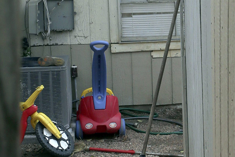 AUSTIN, Texas – A late-night phone call to police about a crying child led to the discovery of eight children unsupervised at a San Antonio home, including a 2-year-old boy chained in the backyard and a 3-year-old girl tied to a door with a dog leash, authorities said Friday.