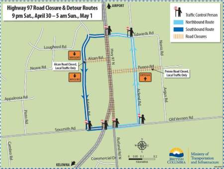 For traffic heading north on Highway 97, a detour will direct motorists east on Old Vernon Road, north on Acland Road, and west on Edwards Road.