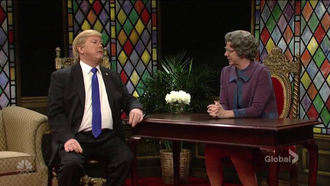 The Church Lady then interviews Trump, played by Darrell Hammond, questioning whether he is actually religious.