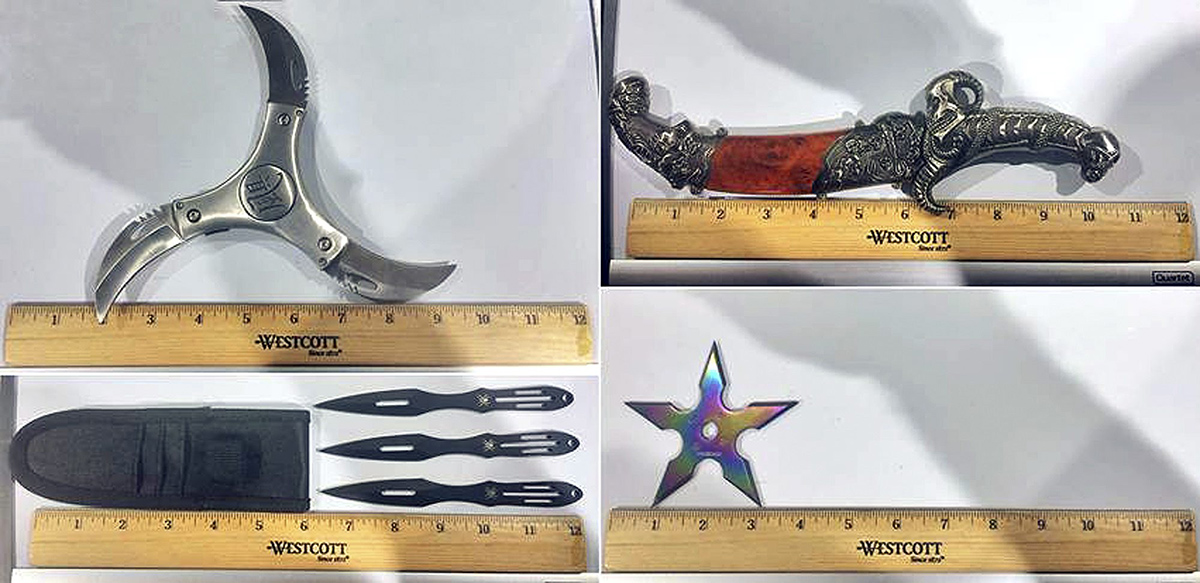 TSA says the New Haven resident was carrying a dagger and several other weapons, including three throwing knives, a traditional throwing star and an expandable throwing star, also known as ninja stars.