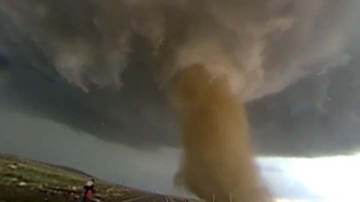 With a 360-degree camera mounted on his vehicle, Timmer and his crew captured jaw-dropping footage of the twister, allowing viewers to toggle the screen and view the storm from ground to sky and peer into the heart of the storm as he speeds towards it.