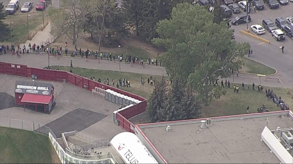 WATCH: Hundreds of evacuees line up at McMahon Stadium to pick up emergency funding relief cards from the province
